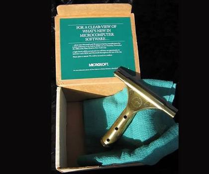 Microsoft reportedly sent out a press kit with a Squeegee (Window washer) and a wash cloth to announce the launch of Windows 1.0.