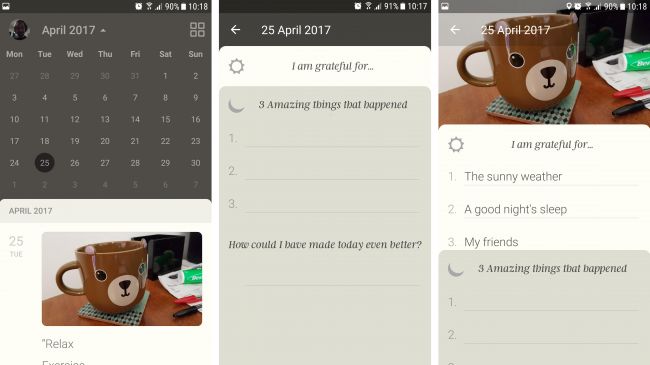 It’s nicely presented, reminds you to add an entry at the beginning and end of each day, lets you add photos, and stores your past entries, so you can be reminded of days past.