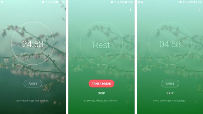 It sounds an alarm after each work or break period, but waits for you to tap to start the next one rather than automatically transitioning, which is handy, since you might not be at an ideal stopping point. It also gives you the option to skip a break altogether.