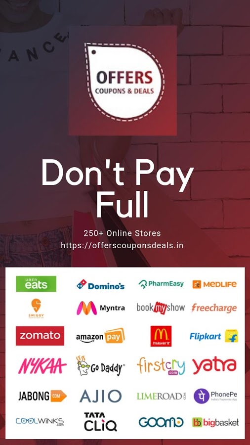 250+ online stores such as Jabong, Ola, FoodPanda, Domino’s, Myntra, MakeMyTrip, Oyo Rooms, Goibibo, Uber, Redbus, BabyOye, Grofers, Bookmyshow, Pepperfry, Big Basket, Lenskart & more.