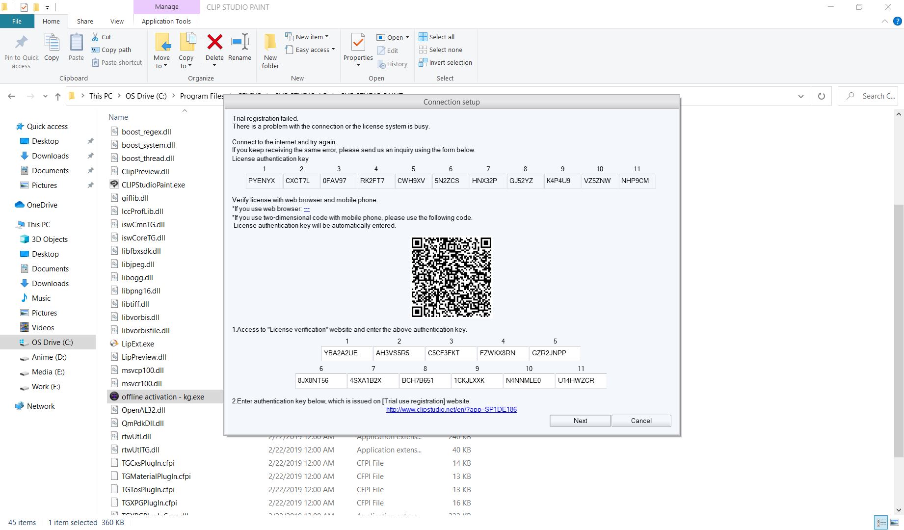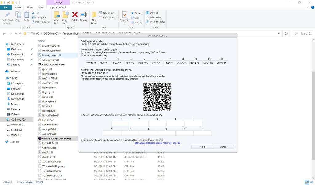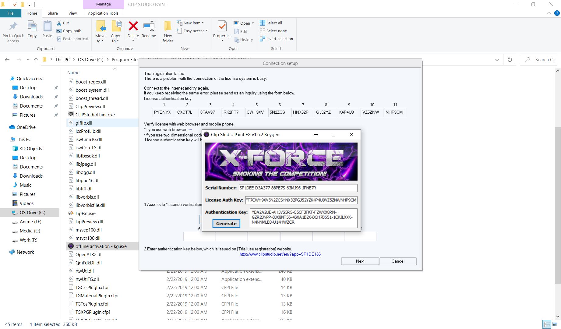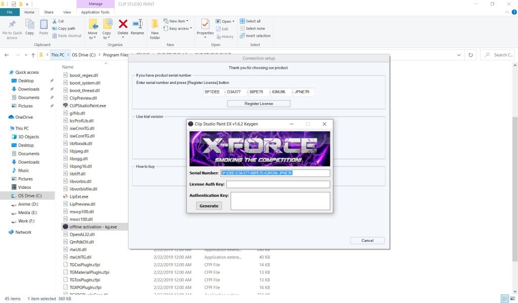 Step 4: Open the file CLIPStudioPaint.exe and also open the file offline activation – kg.exe. Click generate and paste the serial number as shown below.