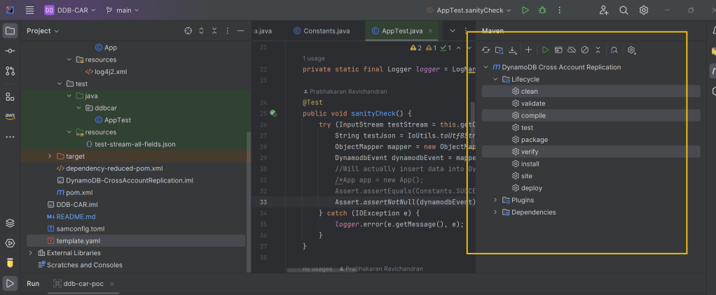Modify the <TARGET_STS_ROLE_ARN> and <TARGET_DDB_TABLE> values accordingly in Constants.java