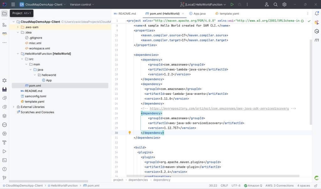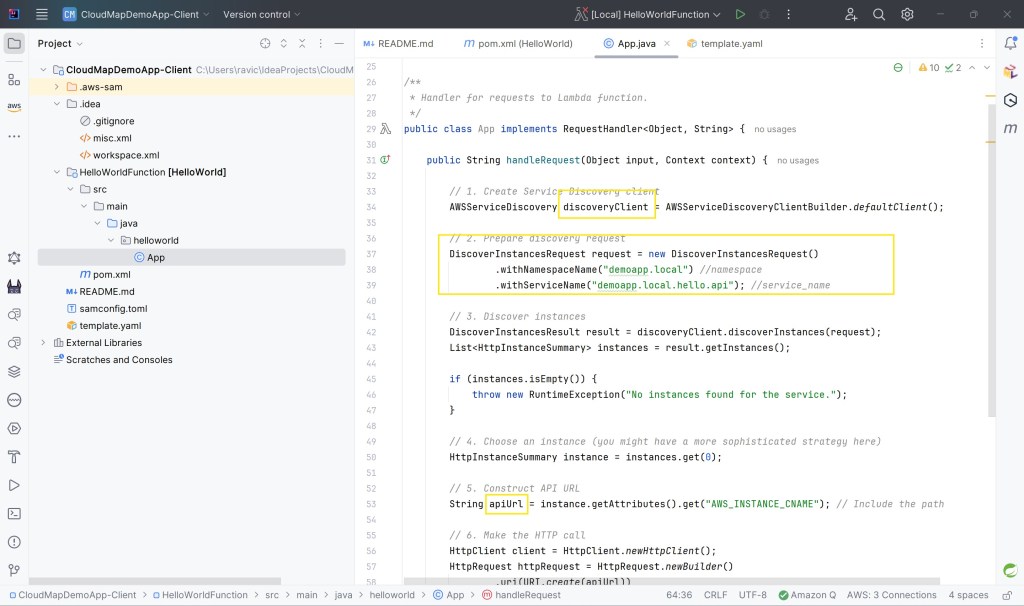 To see the Cloud Map magic in action, let’s deploy our Client Lambda. Its code uses the AWS SDK for Java’s “servicediscovery” library to effortlessly discover and invoke our API Gateway endpoint through Cloud Map. No hardcoded URLs, no worries!