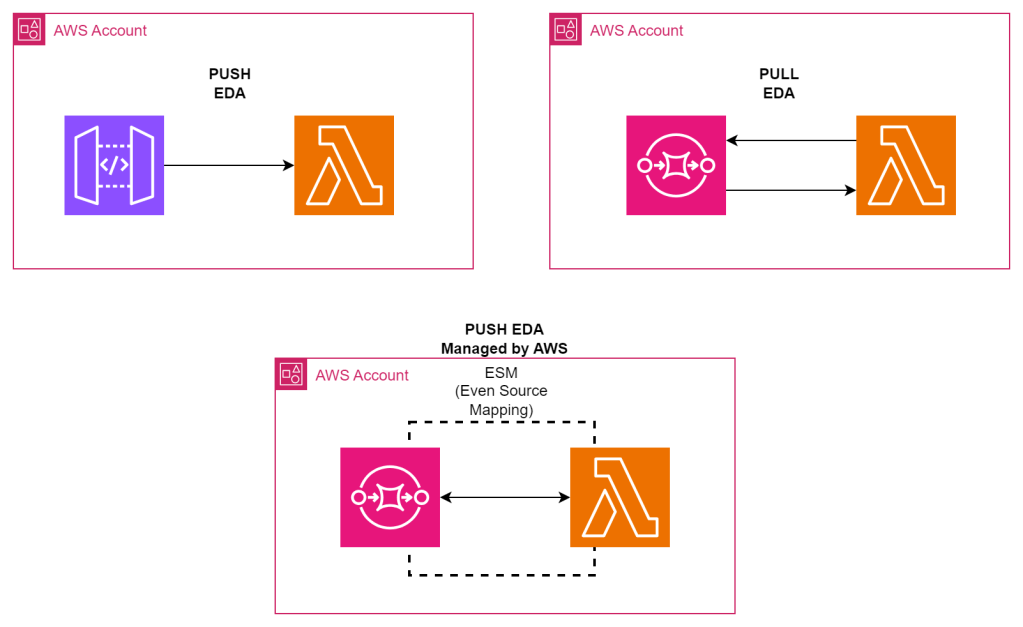 This model typically adds an extra layer of control: you can manage concurrency, back-off, and error handling more granularly. However, it can be a bit more complex to implement because you have to manage the polling aspect—or so it seems until you consider AWS Lambda’s Event Source Mapping magic.