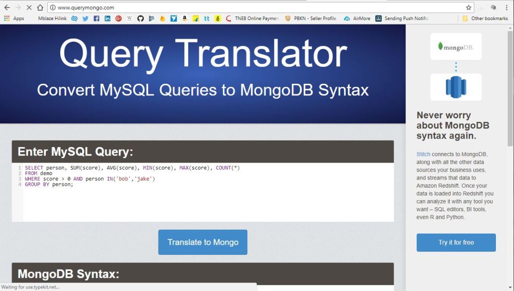 http://www.querymongo.com/ Never worry about MongoDB syntax again. Stitch connects to MongoDB, along with all the other data sources your business uses, and streams that data to Amazon Redshift. Once your data is loaded into Redshift you can analyze it with any tool you want – SQL editors, BI tools, even R and Python.