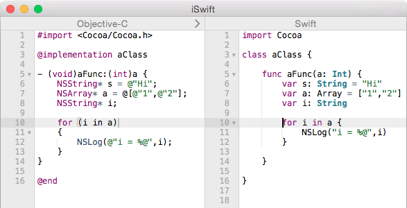 Convert your Objective-C sources to Swift. On the fly. https://iswift.org/playground iSwift is the easiest way to convert your Objective-C code to Swift. Features Up-to-date: Intelligent Swift 3 support Ultra fast: Automatic as-you-type conversion, so that you don’t lose even a single second. Yep, instantly. Drag-and-drop: Drop your Objective-C source onto the app icon, import the…