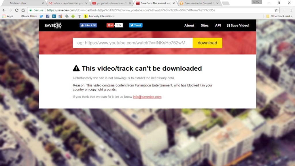 Hello there everyone, This week we are gonna see how to download copyrighted videos from YouTube… I took one of my favourite anime movie to show the process of how it’s done… You can see that, when i try to download it via savedeo, it throws copyrights error… So, don’t worry and copy the same…