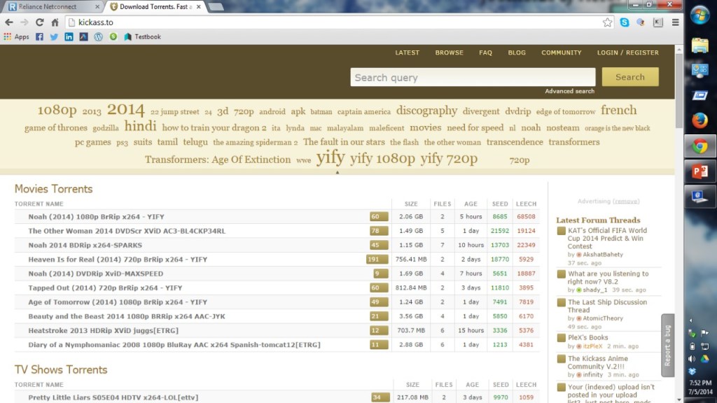 I guess this is a small but VERY USEFUL POST, In my opinion, the torrents site http://kickass.to/ is far more better than any other torrents sites, NOTE: It has many seeders and free from VIRUSES